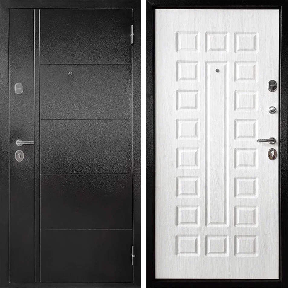 Входная стальная дверь. Внешняя сторона — металл, покрытый износостойкой порошковой краской, цвет «Антик тёмно-коричневый». Внутренняя сторона — панель МДФ 8 мм «Белёный дуб». Отличное бюджетное решение для вашей квартиры, дачи, тамбура, технического помещения, котельной, гаража и прочего. Идеально подходит как временное решение во время стройки и ремонта для квартиры и для частного дома. Пожалуй лучшее сочетание цены и качества в своем классе.