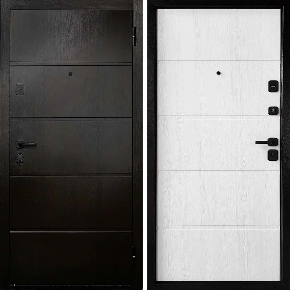Входная стальная дверь. Внешняя сторона — декоративная панель МДФ 8 мм, «Венге». Внутренняя сторона: декоративная панель МДФ 8 мм, «Белое дерево». Внутренняя сторона — панель МДФ 8 мм «Белёный дуб». Отличное бюджетное решение для вашей квартиры, тамбура, любого помещения внутри здания. Идеально подходит для квартиры. Пожалуй лучшее сочетание цены и качества в своем классе.